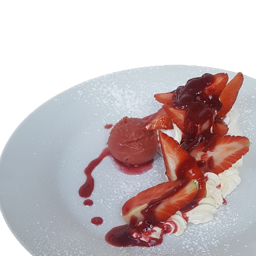 £6.95MERINGUE, STRAWBERRIES, CHANTILLY CREAM, SAUCE
